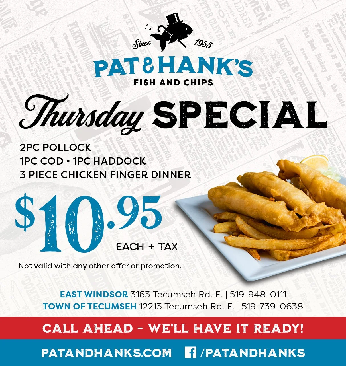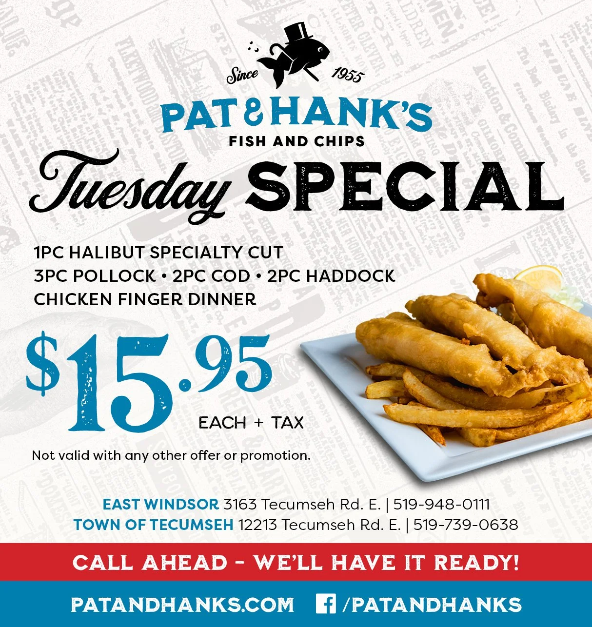 3PC POLLOCK • 2PC COD • 2PC HADDOCK 1PC SPECIAL CUT HALIBUT • CHICKEN FINGER DINNER $15.95 +tax each